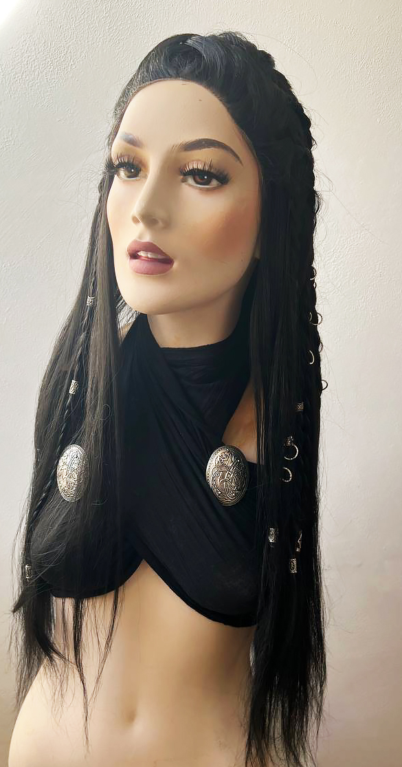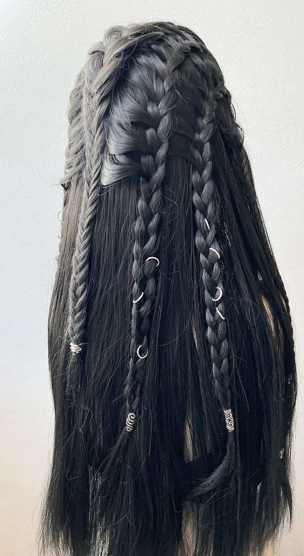 Elevate your look with this stunning lace front braided wig, adorned with metal beads and rings for a fierce Viking-inspired aesthetic. Perfect for Pirate and Viking costumes and LARP adventures this wig is ideal for festival outfits or as a unique pagan or witchy accessory. Whether you're channeling the world of LOTR or searching for the perfect Viking gift, this wig is crafted for fans of fantasy and adventure.