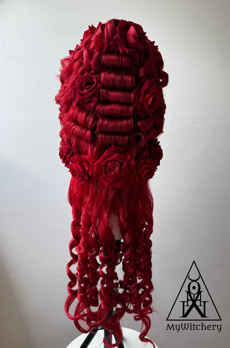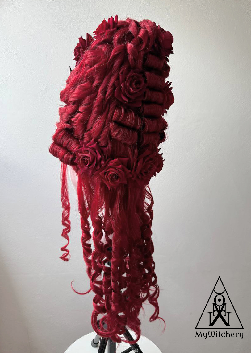 Crafted with dramatic red roses, black spikes and a dramatic black cage hidden within its towering curls, this wig blends rococo and baroque opulence and gothic edge.