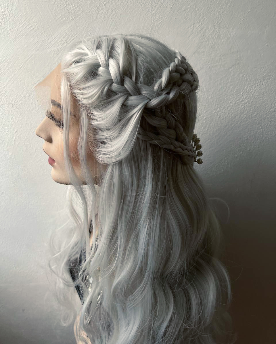 Unleash your inner ruler with this stunning wavy white wig, featuring intricate braids that exude regal fantasy vibes. Perfect for cosplay costumes inspired by Game of Throne or House of the Dragons, this wig is ideal for LARP, festival outfits, or any fantasy-themed event. Its ethereal design and braided elegance make it a show-stopping accessory for creating unforgettable looks.